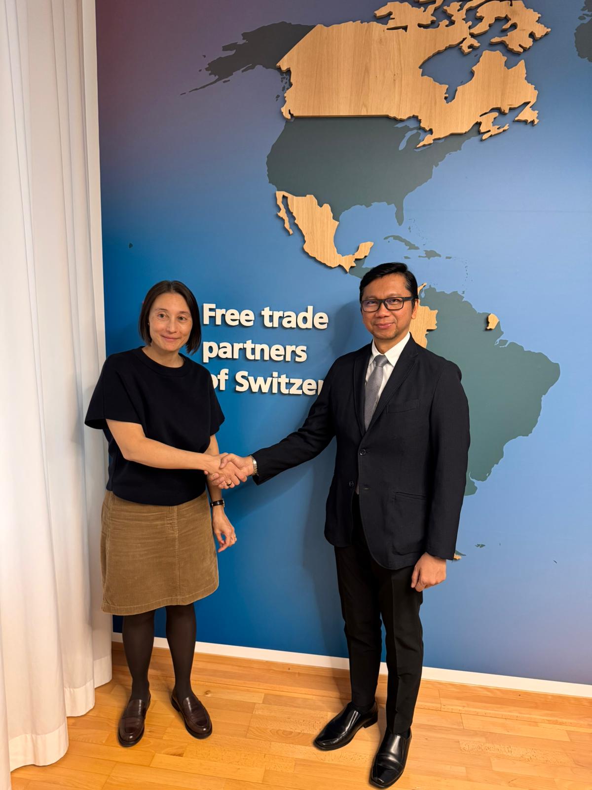Direktur Jenderal Perundingan Perdagangan Internasional, Djatmiko Bris Witjaksono bertemu dengan Head of Asia/Oceania Division, State Secretariat for Economic Affairs Swiss, Ms. Natalie Rast dalam rangka memperkuat kerja sama di bidang perdagangan dan investasi antara Indonesia dan Swiss.